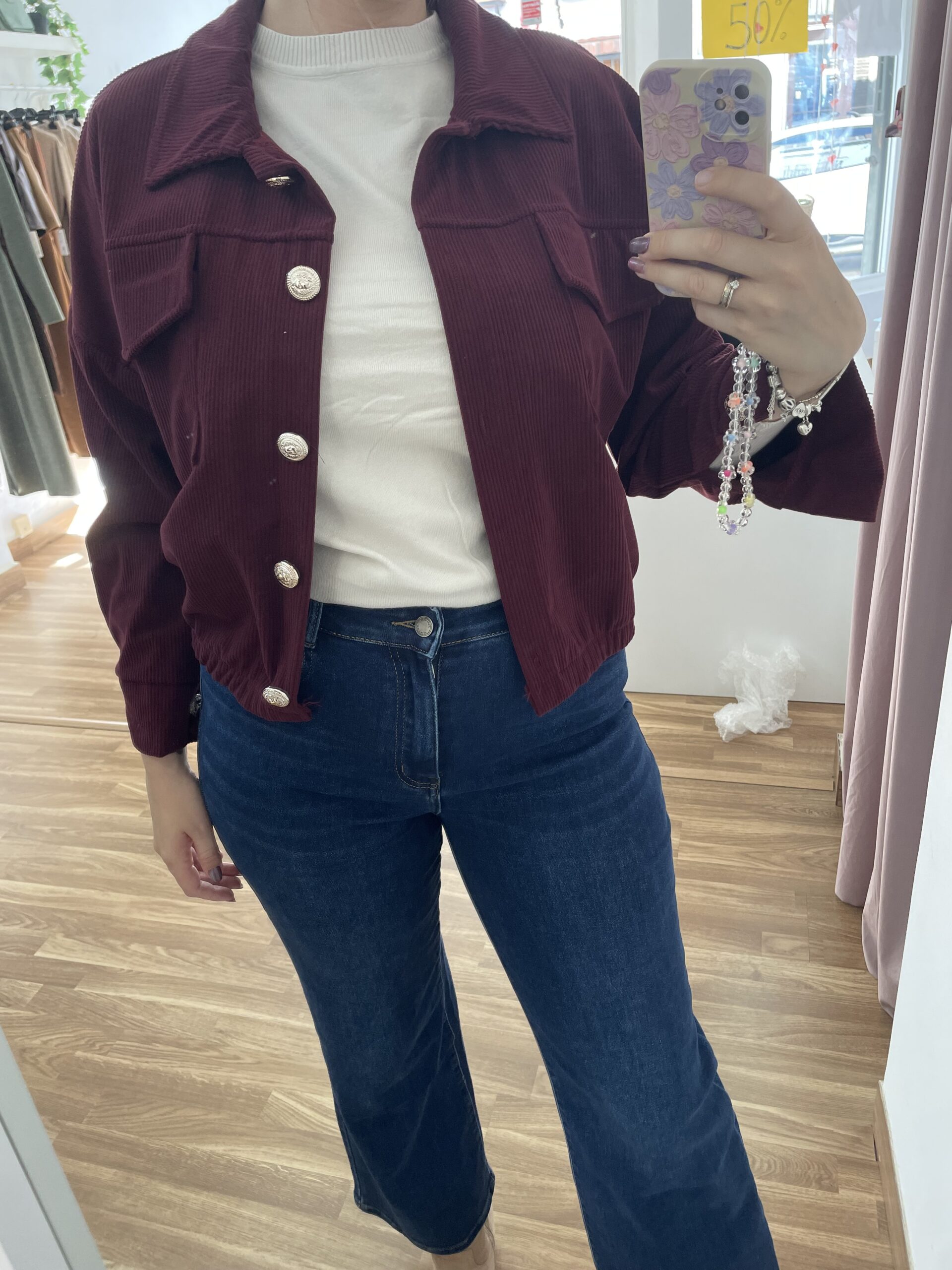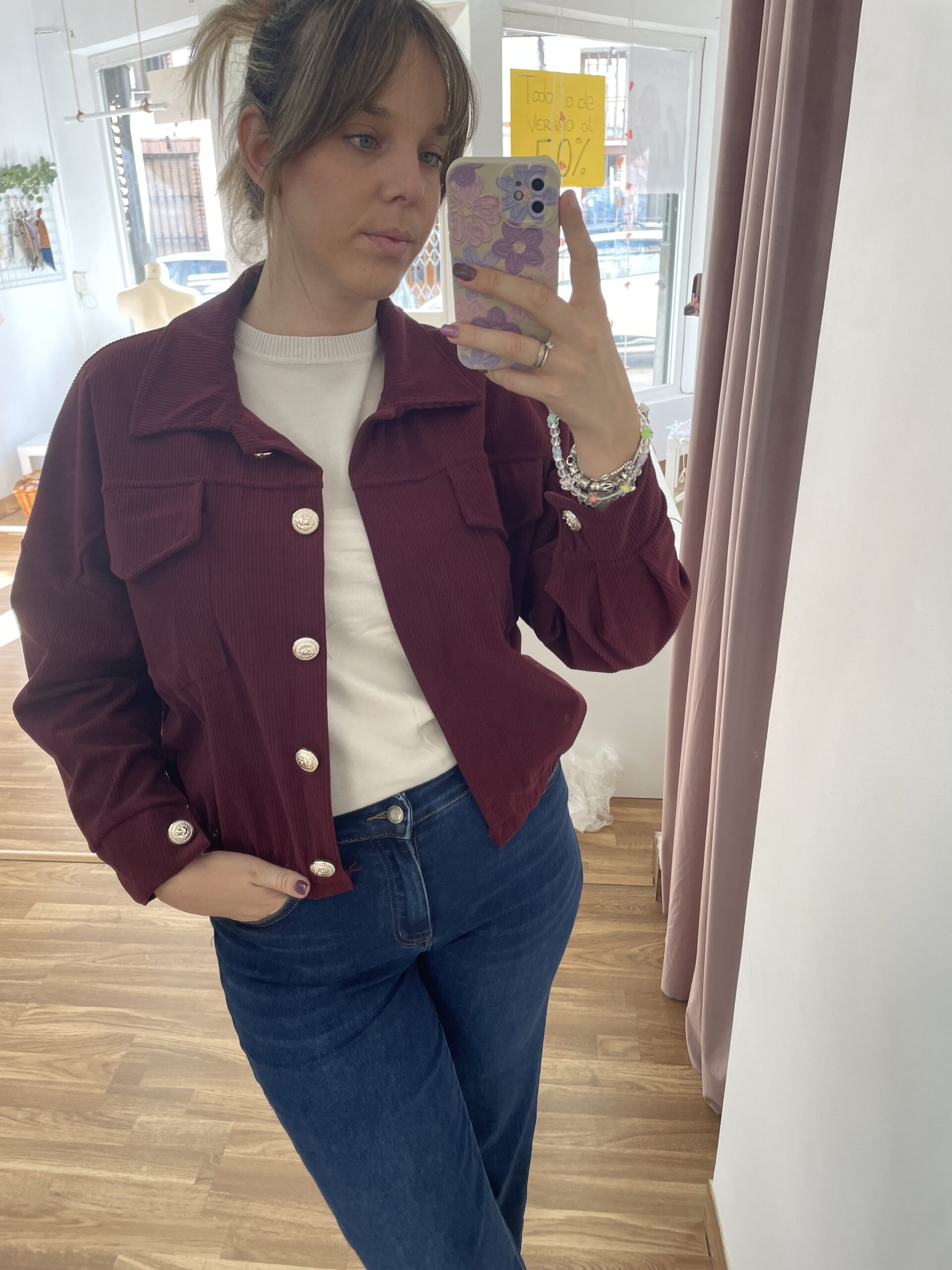 Bomber de pana con goma en la cintura y botones dorados. Talla única (34-44)
